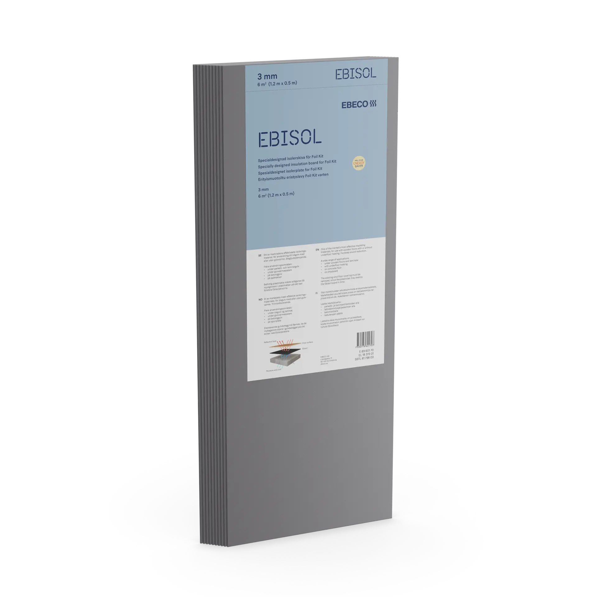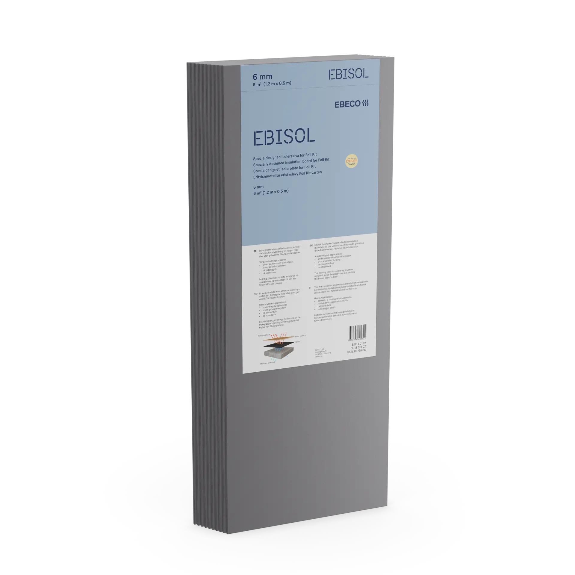 Ebisol on energiatehokas alustalevy, joka on tarkoitettu käytettäväksi puu- ja laminaattilattioiden alla. Levyllä on erittäin hyvät askelääntä vaimentavat ominaisuudet sekä hyvä eristyskyky. Ebisol on joustava ja asennettavissa useimmille alustoille. Se on helppo leikata ja muotoilla pinnan mukaan.
