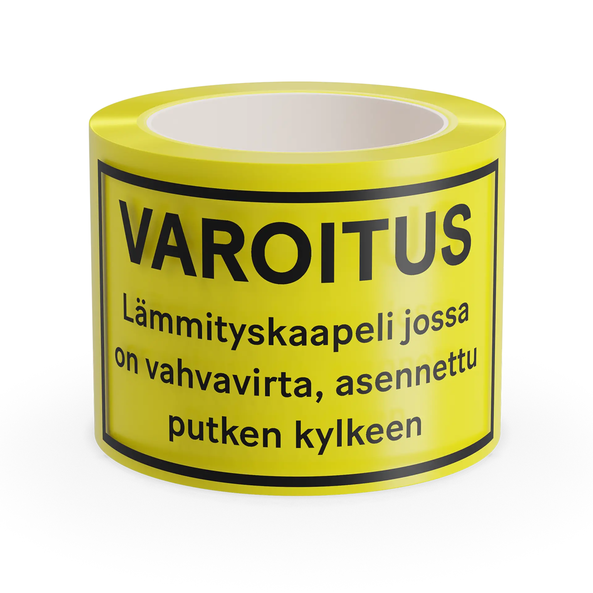 Keltainen varoitusteippi lämpökaapelijärjestelmiin. Ilmoittaa, että lämmityskaapeli on asennettu putkiin.